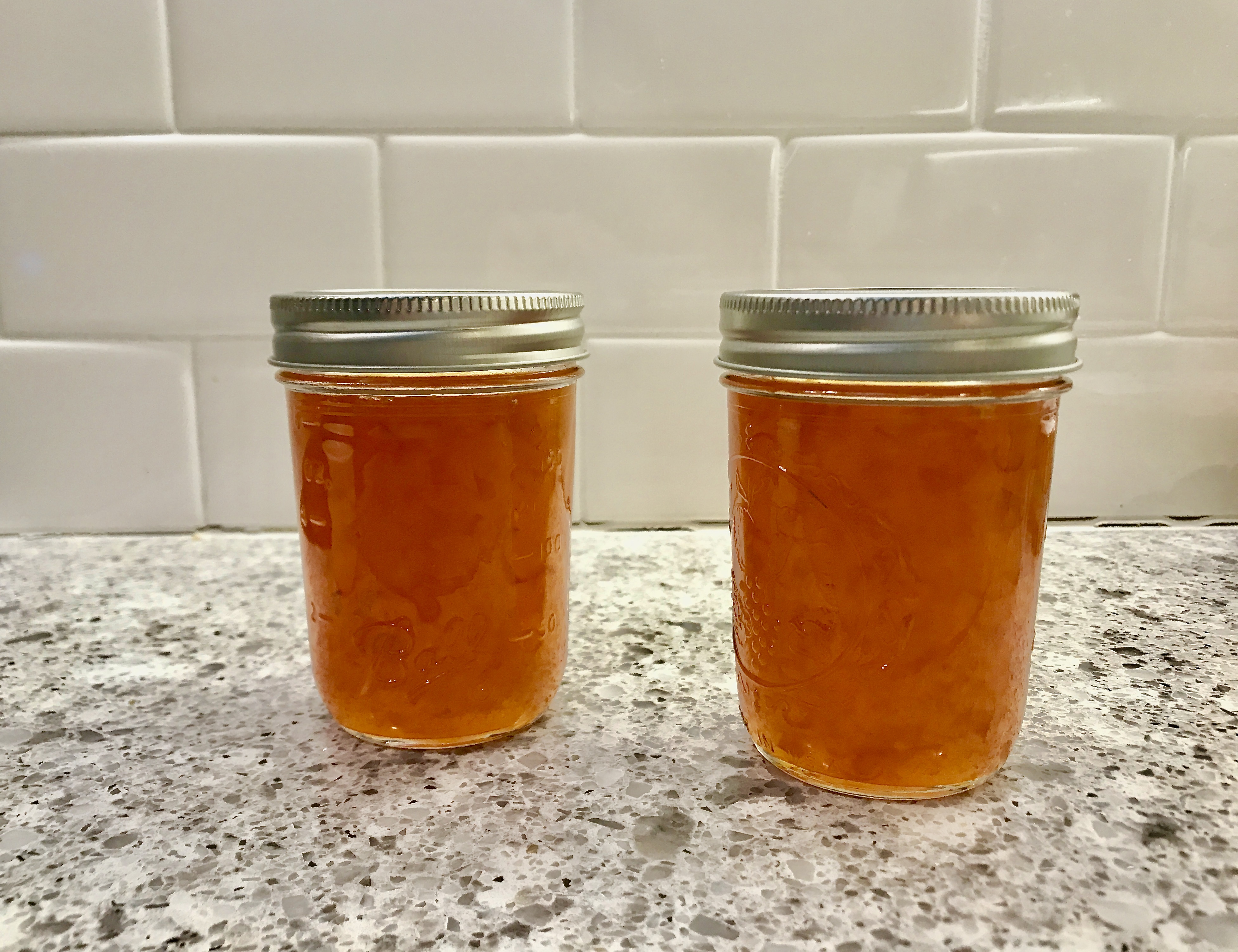 I inherited another potted citrus bush/tree a few years ago. I have no idea what it is, but it produces small, juicy, very thin-skinned, very sour fruit full of seeds. Satsuma? Whatever it is, it’s an old survivor. If the story that came with it is true, it’s at least 50 years old. Is that even possible? Anyway, this year its fruit are ripening in dribs and drabs, and the first picking went into the marmalade pot. I used the same basic recipe, but the rinds cook to tender much faster than the Meyer lemons do, maybe in half the time. 340 grams of fruit made two half-pint jars, plus a little extra for the fridge. Like its lemon cousin, this orange marmalade packs a flavor wallop. More (very) small batches to come as the fruit ripens.