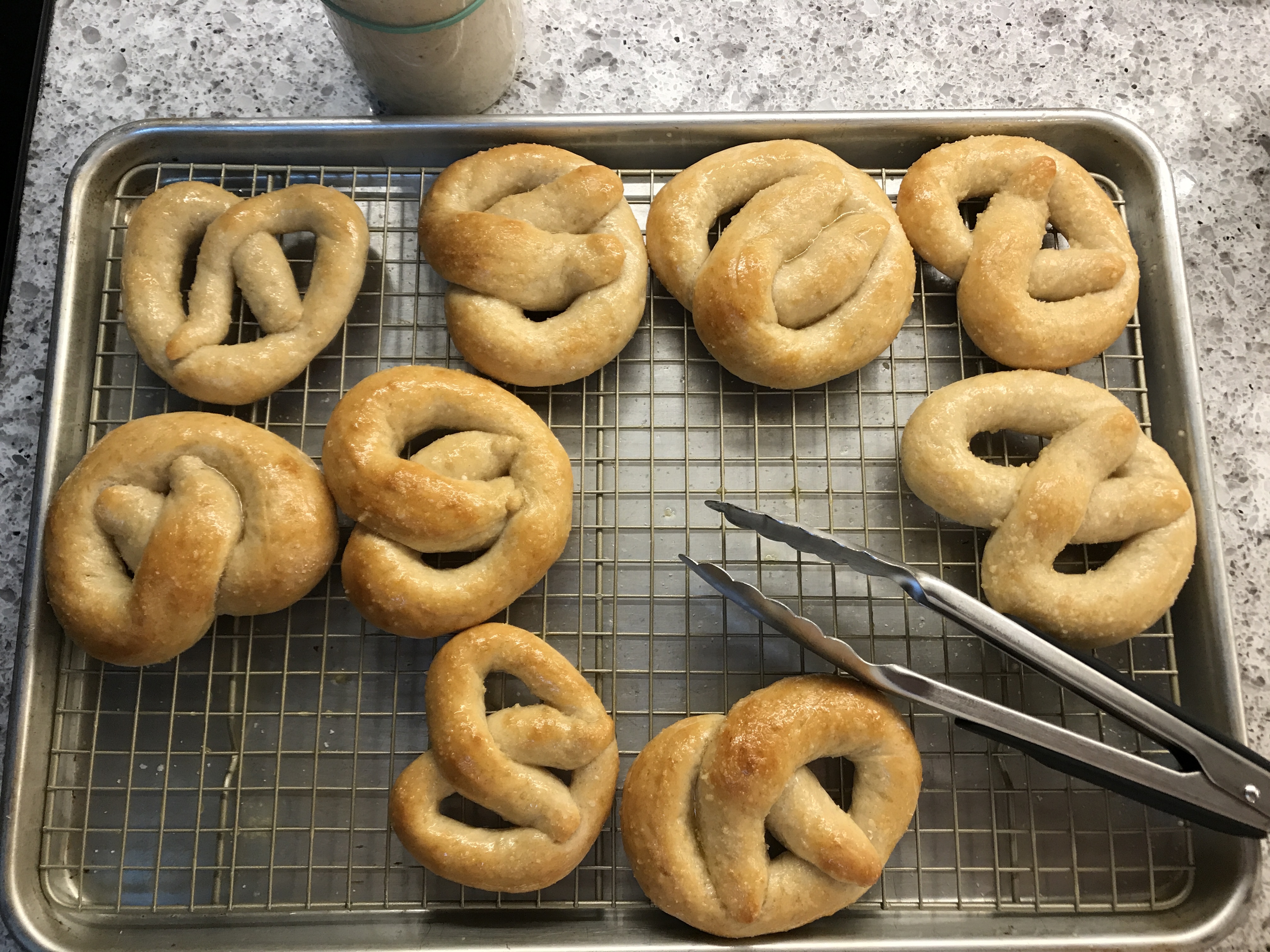 Lately I’m getting sick of pizza every. single. Saturday. night. Kiddo likes her routine, but sometimes I’m just over it. But Nathan still needed a feeding, and throwing away the discard is anathema to me. I also can’t throw away a chicken carcass without making a batch of chicken broth first, but I digress. So instead I made pretzels with the discard, and they are almost as easy as pizza dough. A few adjustments: I subbed one cup of 2% milk for the water and nonfat dry milk, I skipped the diastatic malt powder because I didn’t have any and used sugar per the recipe, I sprinkled them with Diamond Crystal kosher salt because I didn’t have pretzel salt, and I brushed them with garlic butter at the end. My shaping skills are, ahem, inconsistent, and the recipe does make a dozen, but we ate some before I remembered to take a picture.