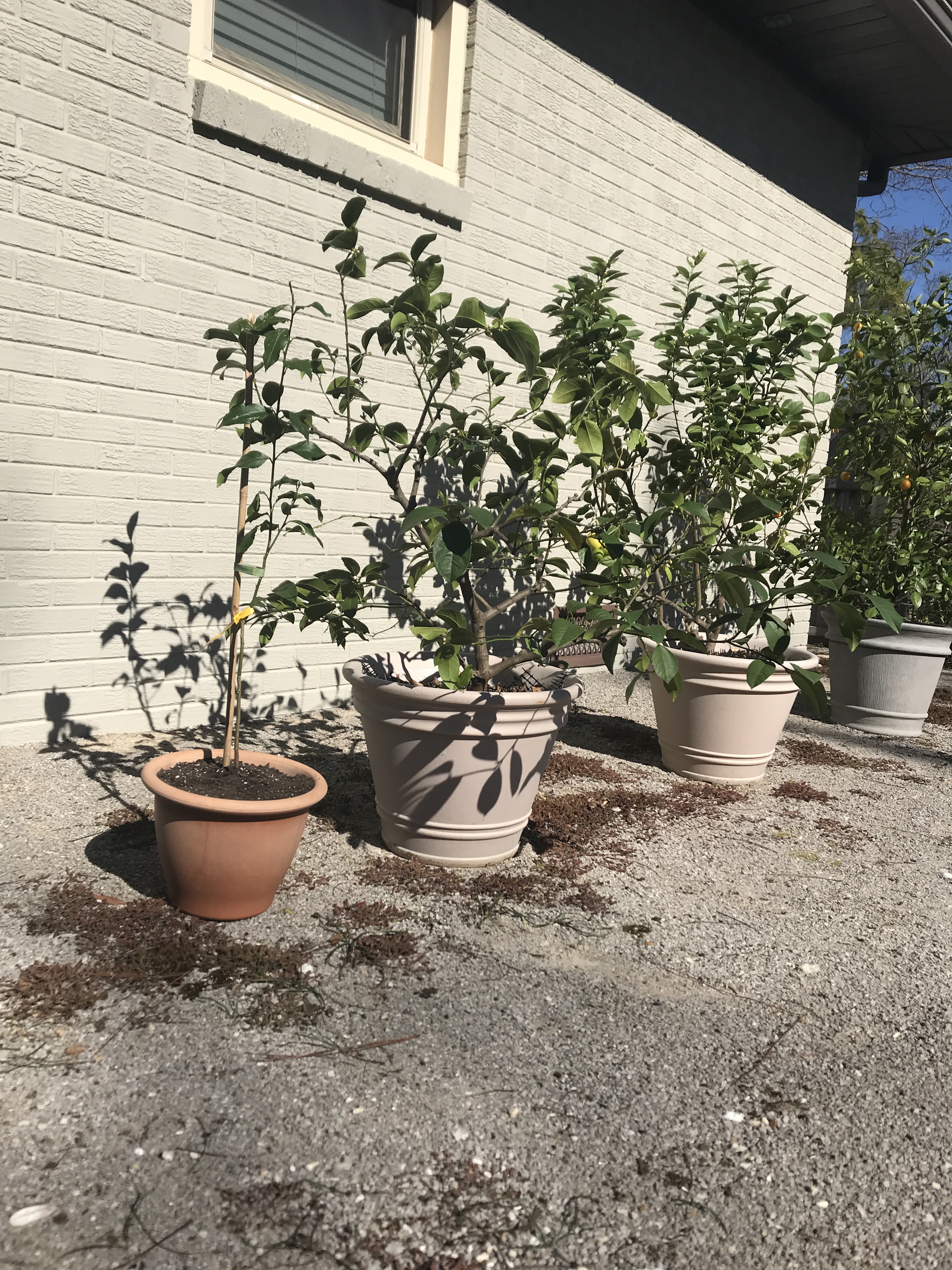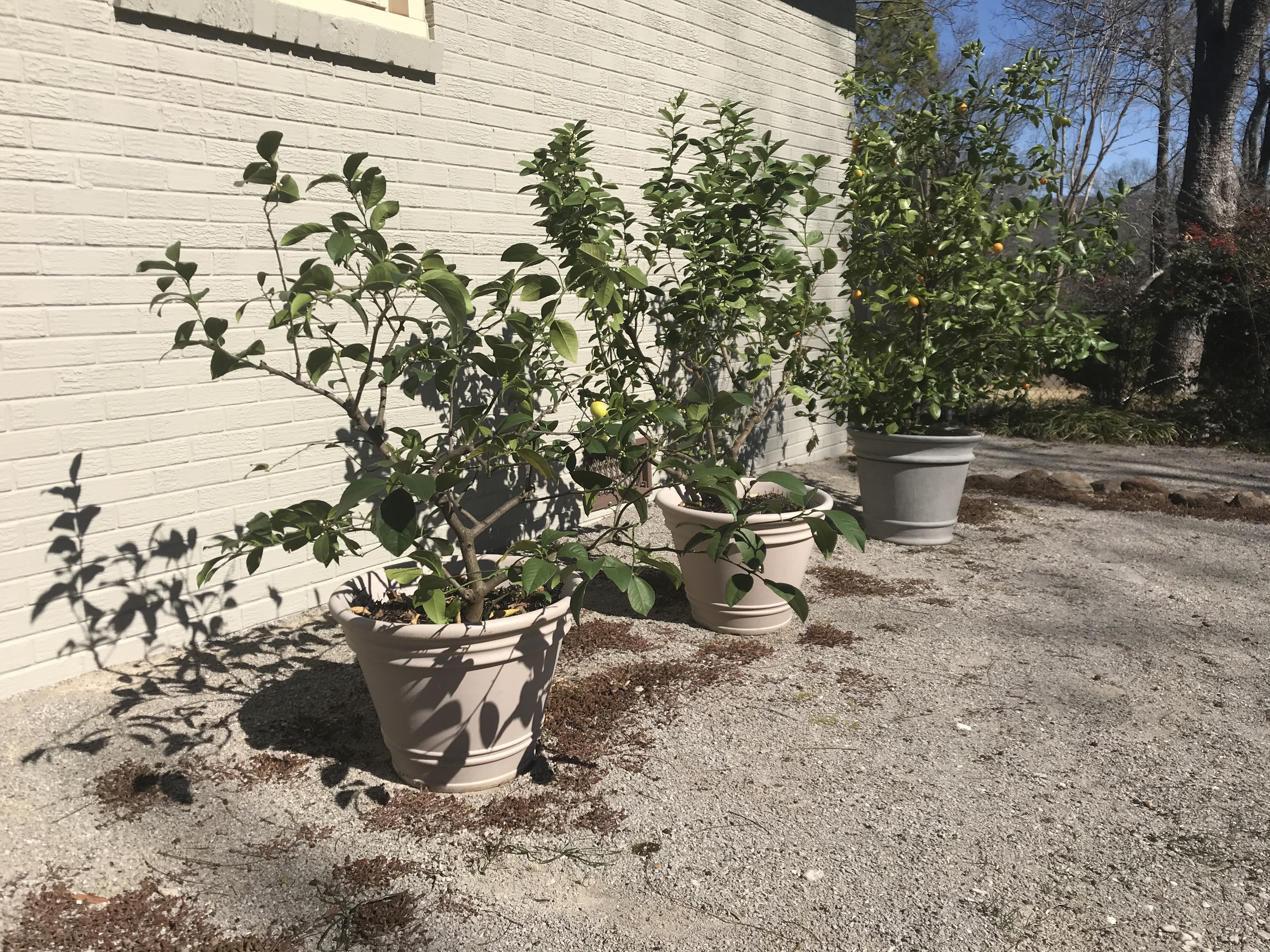 The forecast is good—no hard freezes for the week—so the potted citrus grove was on the move today, back outside for an afternoon of sunshine, a chance of a good rain soaking tonight and tomorrow morning, and a mild week ahead. A $30 Harbor Freight hand truck has paid for itself many times over just for moving them in and out. The south-southeast facing corner of my back yard is its own little microclimate, always a few degrees warmer than anywhere else, and they are happy there. All three are blooming too, and when the bees and other bugs wake up hungry this week, they’ll be happy to find the flowers. Yay, pollinators!